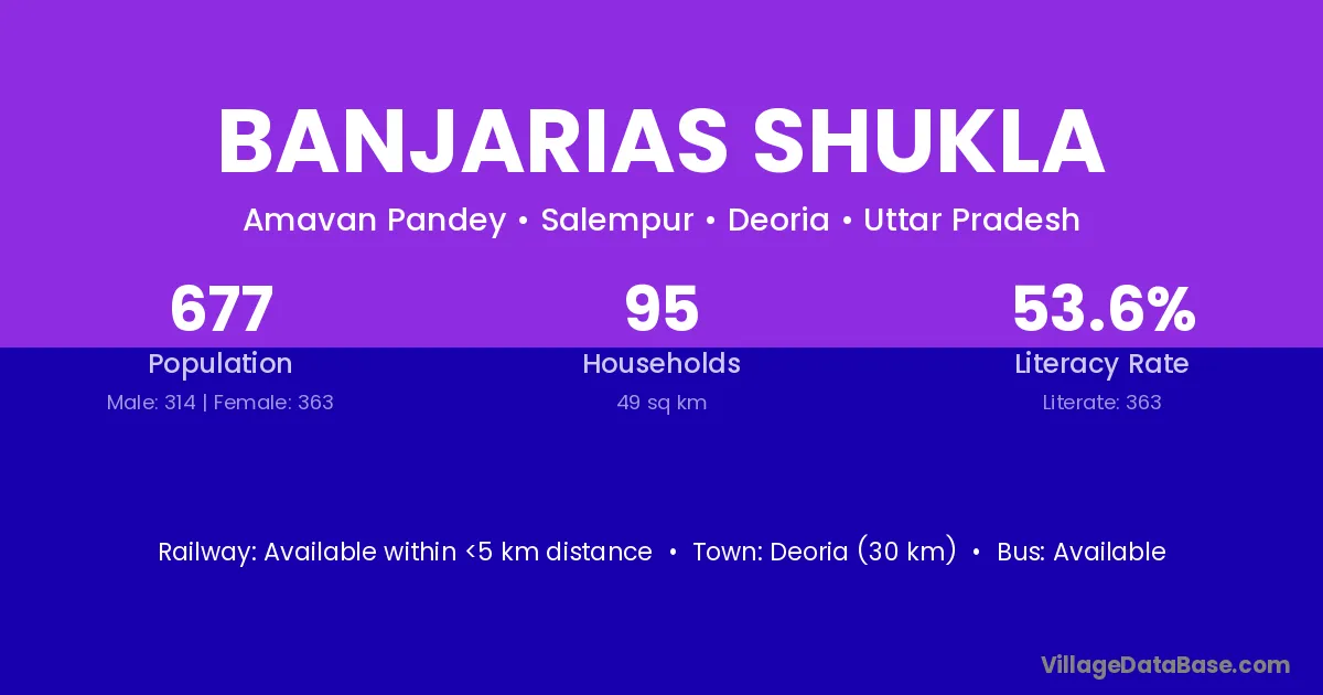 Deoria (30 km) is the nearest town to Banjarias Shukla village for major economic activities and is located approximately 30 km away.