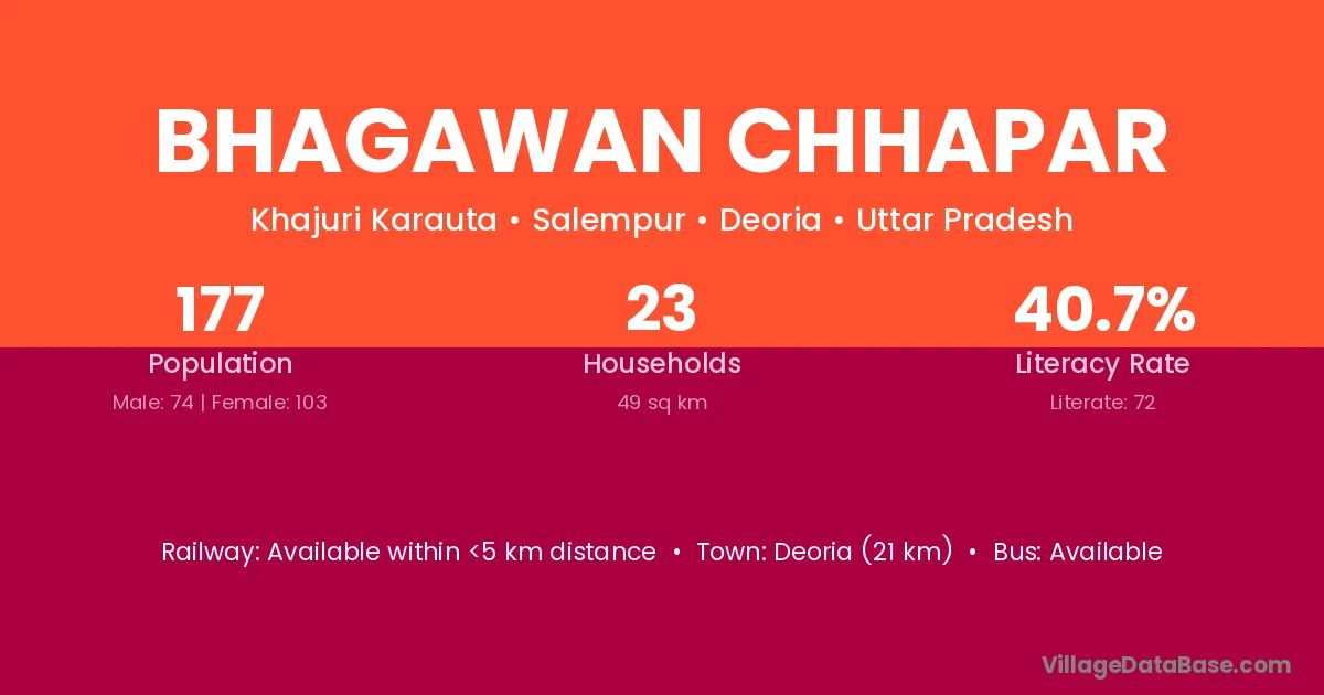 Deoria (21 km) is the nearest town to Bhagawan Chhapar village for major economic activities and is located approximately 21 km away.