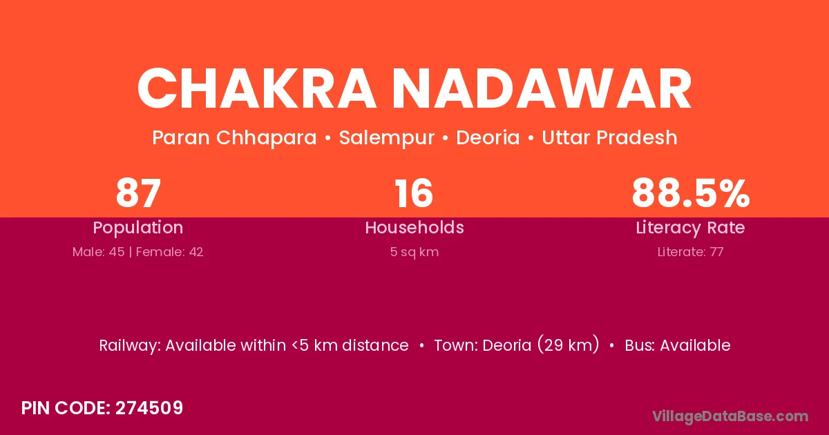 Deoria (29 km) is the nearest town to Chakra Nadawar village for major economic activities and is located approximately 29 km away.