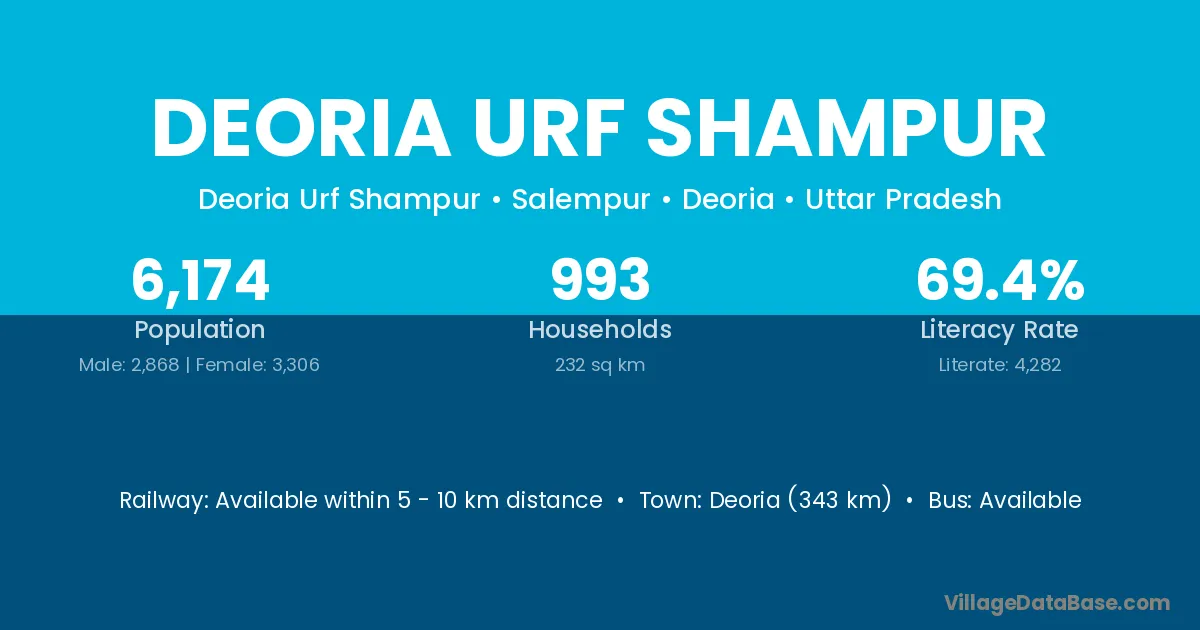 Deoria Urf Shampur village has a total population of 6,174 people, of which 2,868 are males and 3,306 are females.