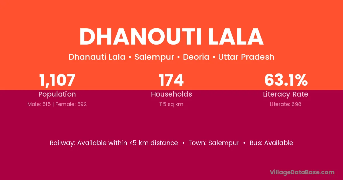 Dhanouti Lala village has a total population of 1,107 people, of which 515 are males and 592 are females.