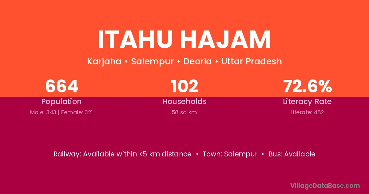 Itahu Hajam village has a total population of 664 people, of which 343 are males and 321 are females.