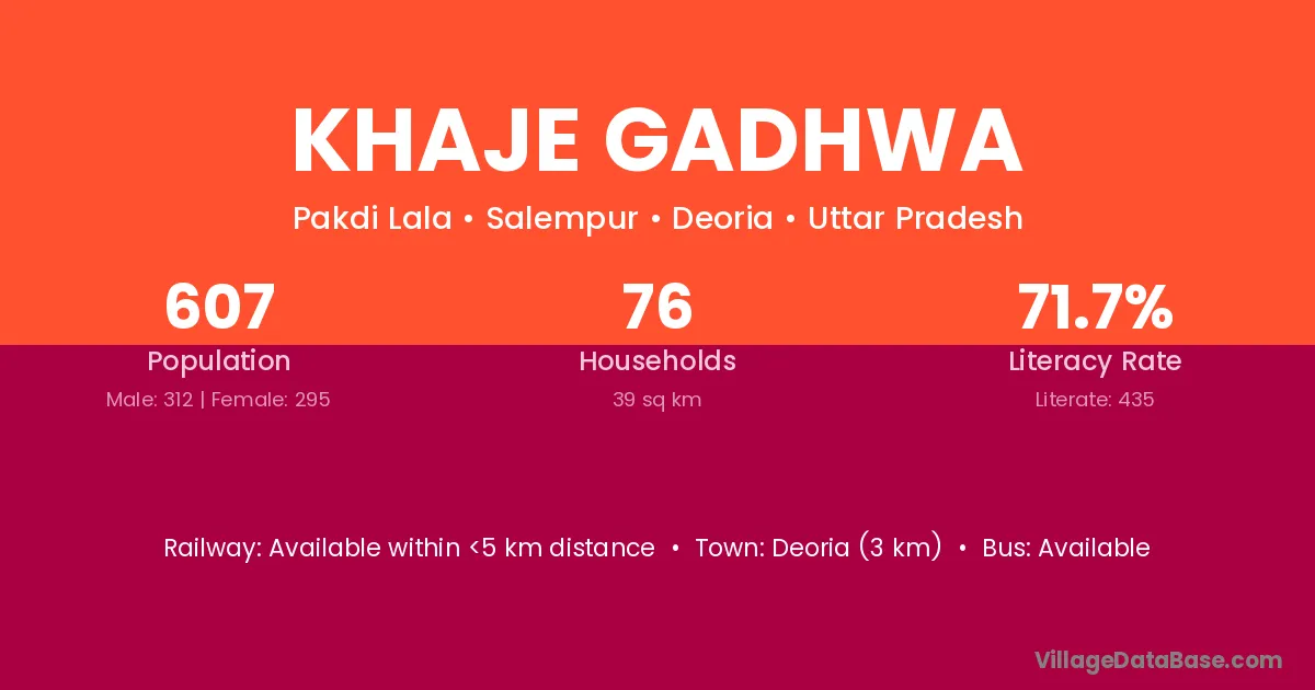 Khaje Gadhwa village has a total population of 607 people, of which 312 are males and 295 are females.