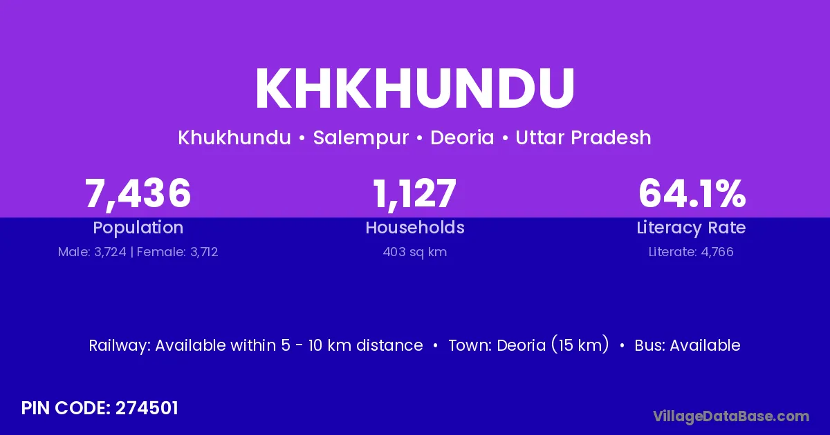 Deoria (15 km) is the nearest town to Khkhundu village for major economic activities and is located approximately 15 km away.