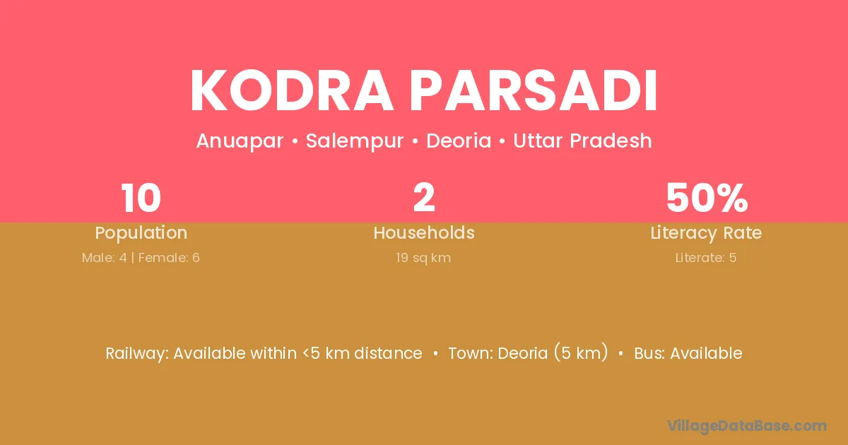 Deoria (5 km) is the nearest town to Kodra Parsadi village for major economic activities and is located approximately 5 km away.