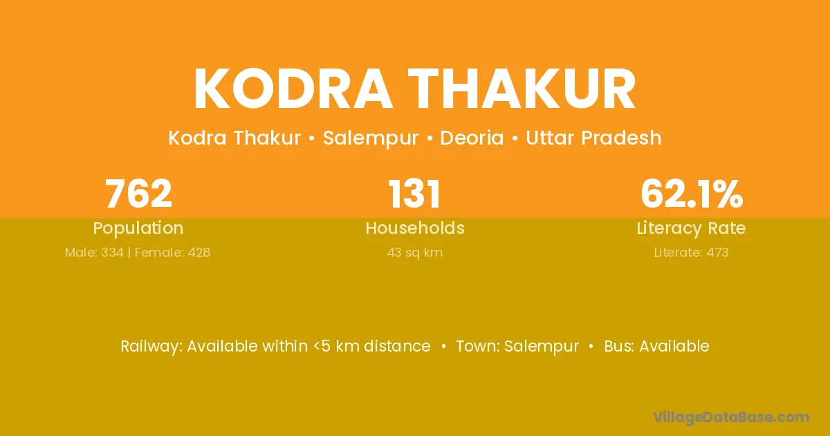 Kodra Thakur village has a total population of 762 people, of which 334 are males and 428 are females.