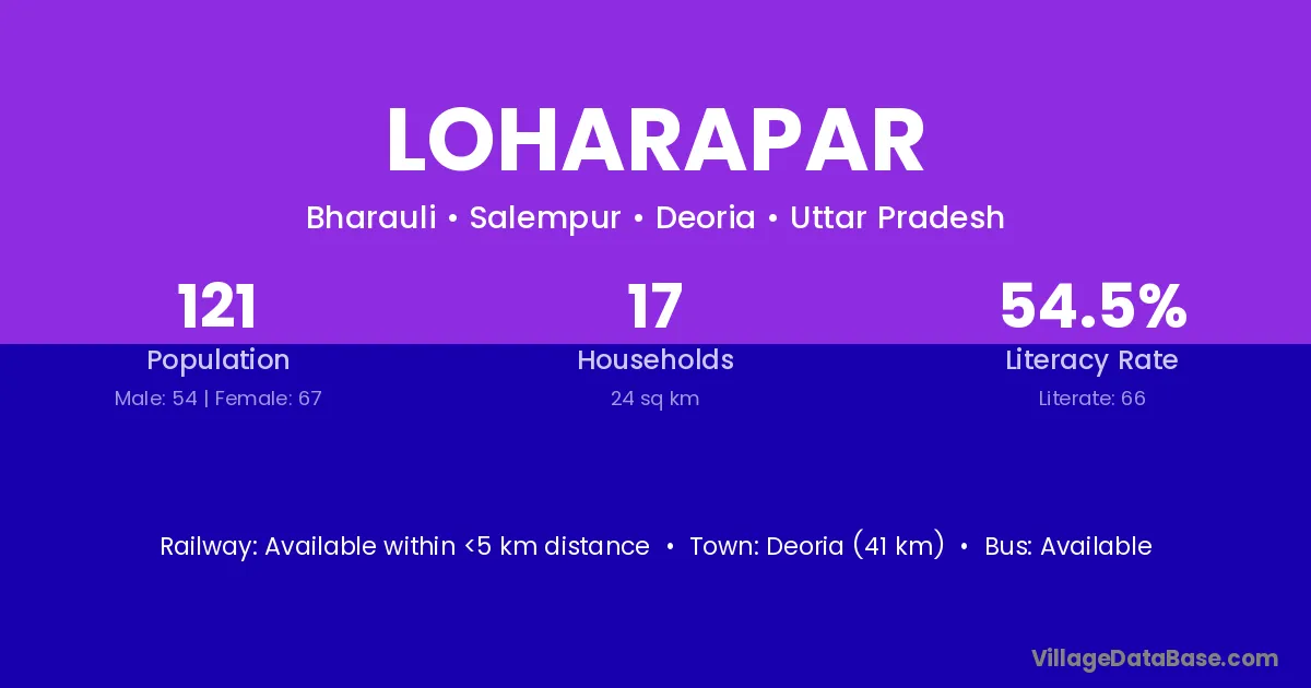Deoria (41 km) is the nearest town to Loharapar village for major economic activities and is located approximately 41 km away.