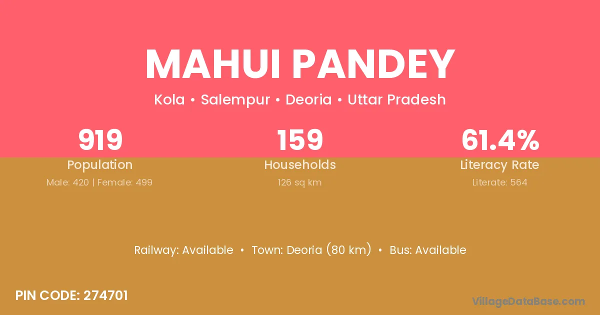 Mahui Pandey village has a total population of 919 people, of which 420 are males and 499 are females.
