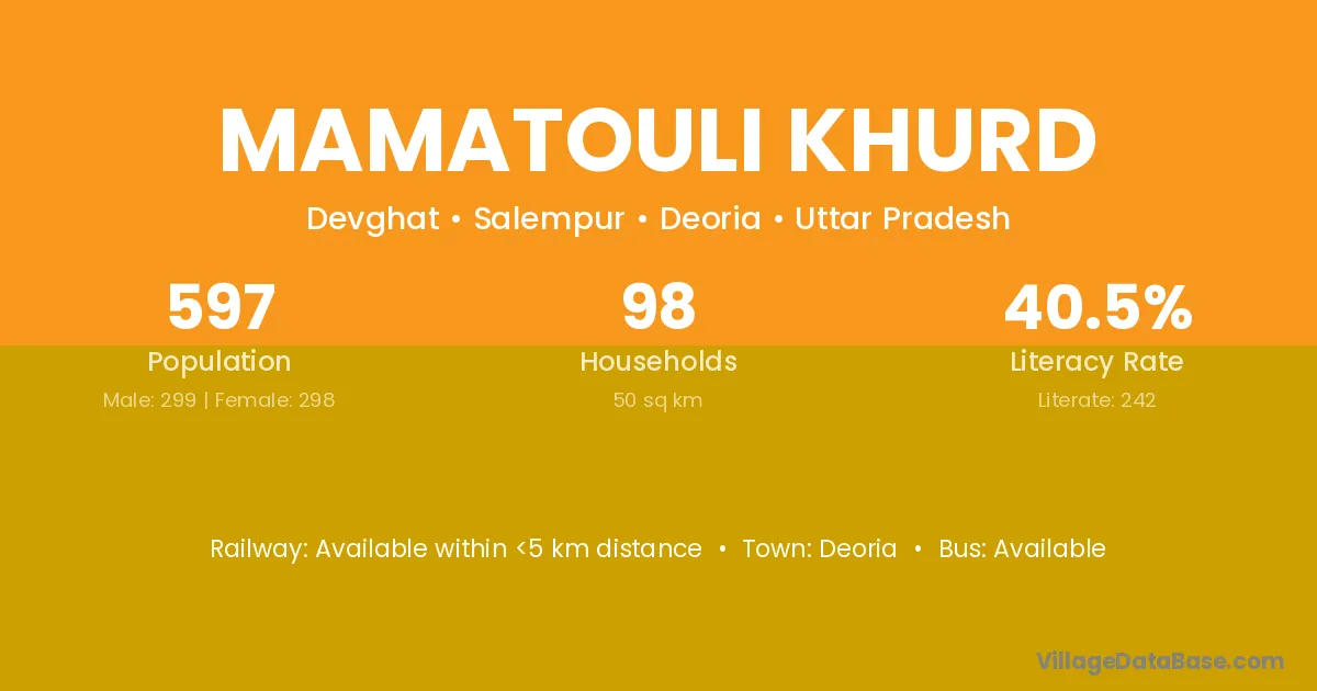 Mamatouli Khurd village has a total population of 597 people, of which 299 are males and 298 are females.