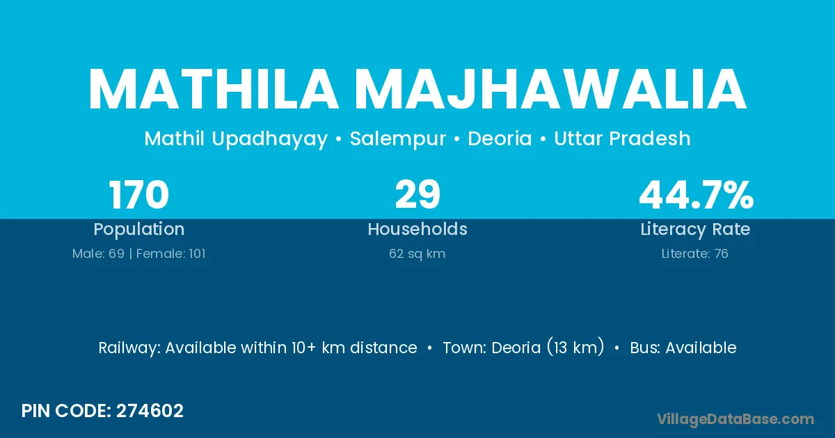 Mathila Majhawalia village has a total population of 170 people, of which 69 are males and 101 are females.