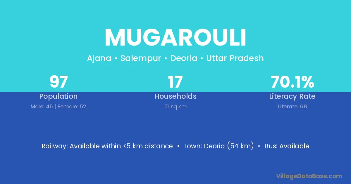 Deoria (54 km) is the nearest town to Mugarouli village for major economic activities and is located approximately 54 km away.