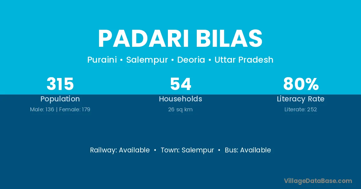 Padari Bilas village has a total population of 315 people, of which 136 are males and 179 are females.