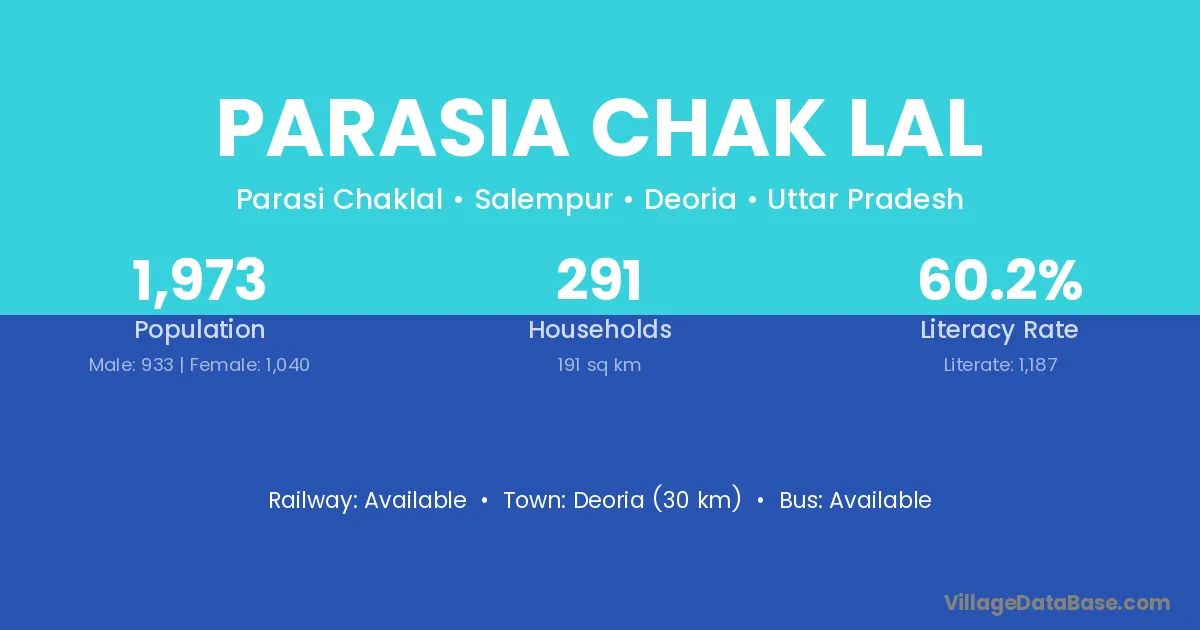 Deoria (30 km) is the nearest town to Parasia Chak Lal village for major economic activities and is located approximately 30 km away.