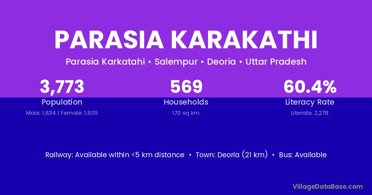 Deoria (21 km) is the nearest town to Parasia Karakathi village for major economic activities and is located approximately 21 km away.