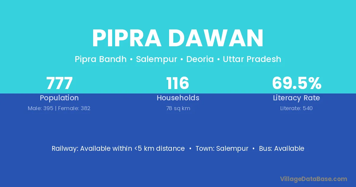 Pipra Dawan village has a total population of 777 people, of which 395 are males and 382 are females.