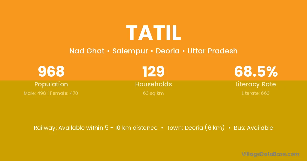 Deoria (6 km) is the nearest town to Tatil village for major economic activities and is located approximately 6 km away.