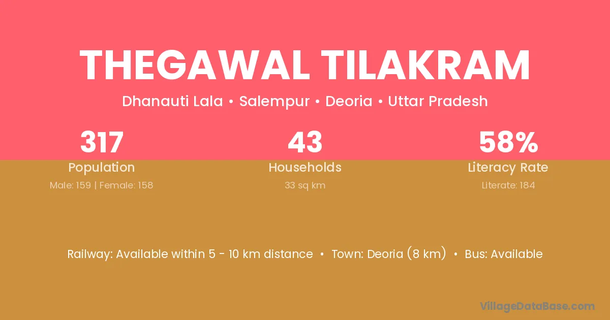 Thegawal Tilakram village has a total population of 317 people, of which 159 are males and 158 are females.