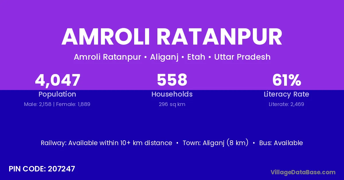 Aliganj (8 km) is the nearest town to Amroli Ratanpur village for major economic activities and is located approximately 8 km away.