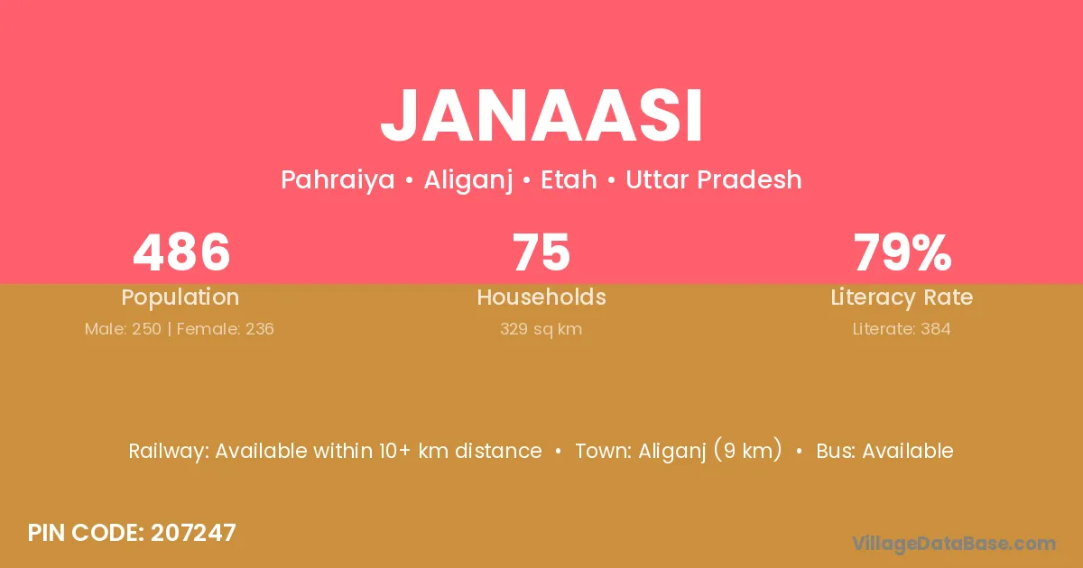 Aliganj (9 km) is the nearest town to Janaasi village for major economic activities and is located approximately 9 km away.