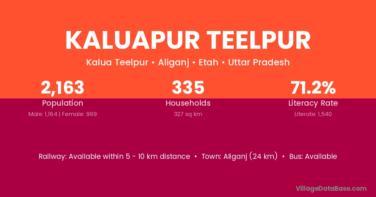 Aliganj (24 km) is the nearest town to Kaluapur Teelpur village for major economic activities and is located approximately 24 km away.
