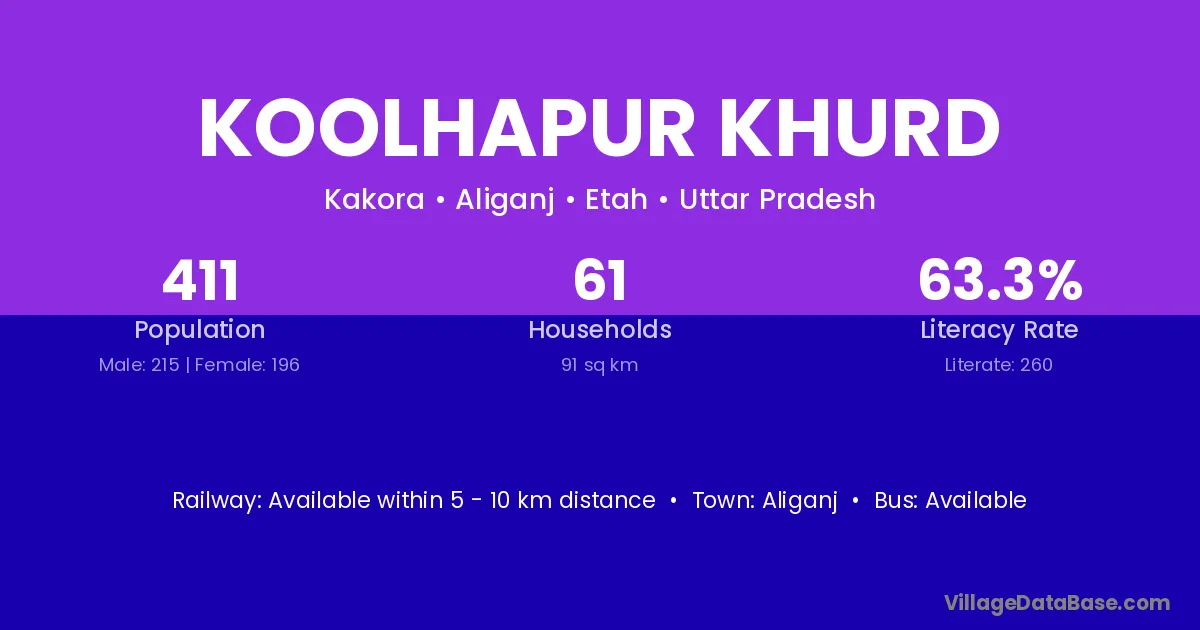 Koolhapur Khurd village has a total population of 411 people, of which 215 are males and 196 are females.