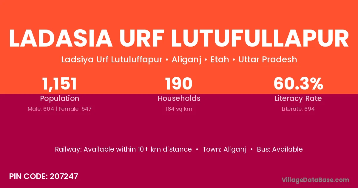 Ladasia Urf Lutufullapur village has a total population of 1,151 people, of which 604 are males and 547 are females.