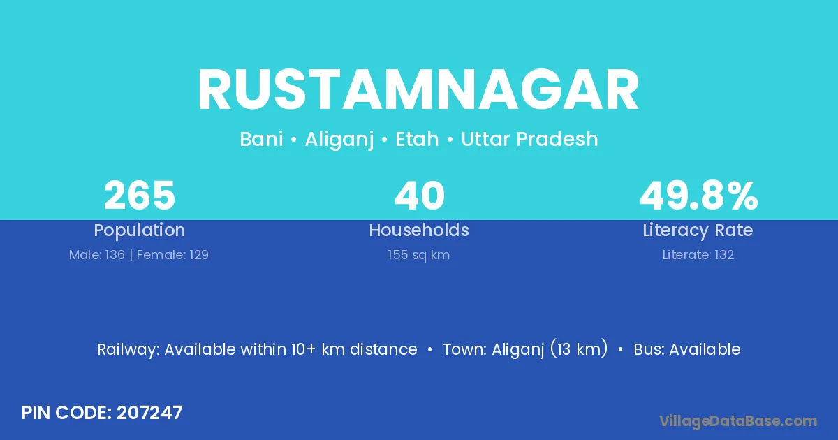 Aliganj (13 km) is the nearest town to Rustamnagar village for major economic activities and is located approximately 13 km away.