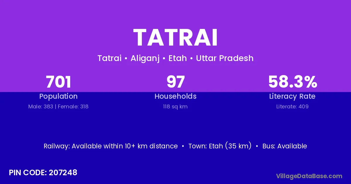 Etah (35 km) is the nearest town to Tatrai village for major economic activities and is located approximately 35 km away.