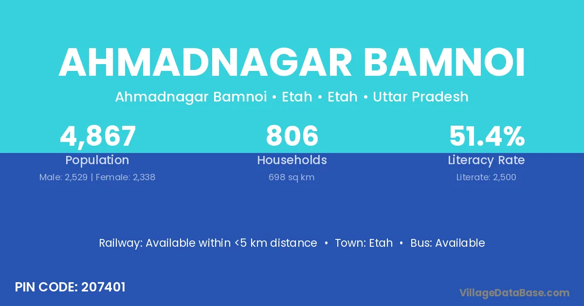 Etah is the nearest town to Ahmadnagar Bamnoi village for major economic activities