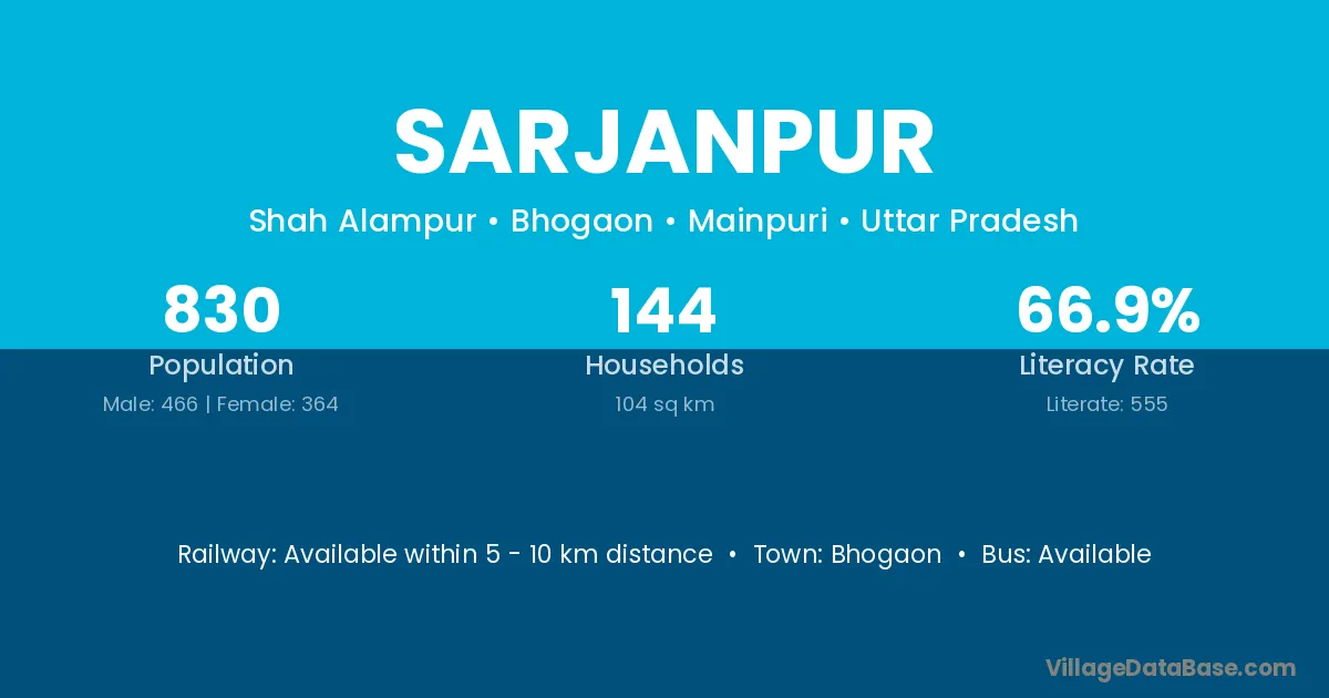 Etah (17 km) is the nearest town to Sarjanpur village for major economic activities and is located approximately 17 km away.