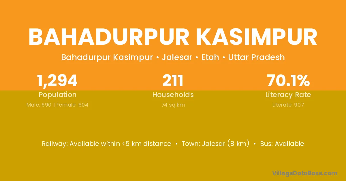 Jalesar (8 km) is the nearest town to Bahadurpur Kasimpur village for major economic activities and is located approximately 8 km away.