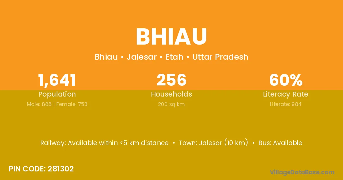 Jalesar (10 km) is the nearest town to Bhiau village for major economic activities and is located approximately 10 km away.