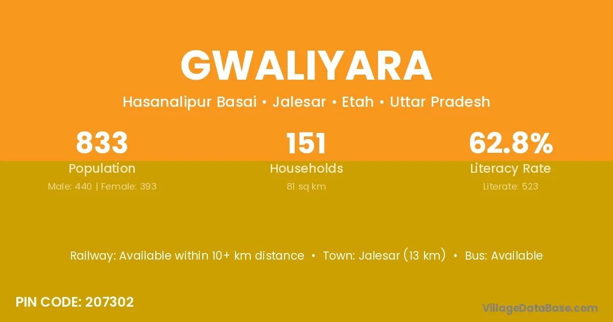 Jalesar (13 km) is the nearest town to Gwaliyara village for major economic activities and is located approximately 13 km away.