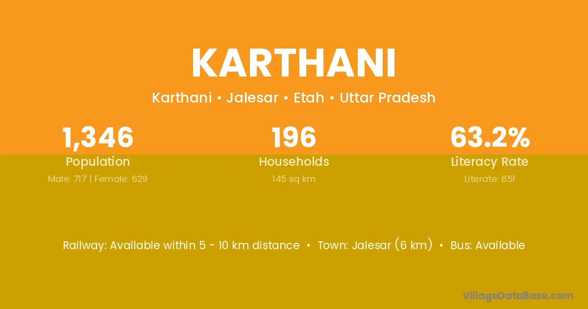 Jalesar (6 km) is the nearest town to Karthani village for major economic activities and is located approximately 6 km away.