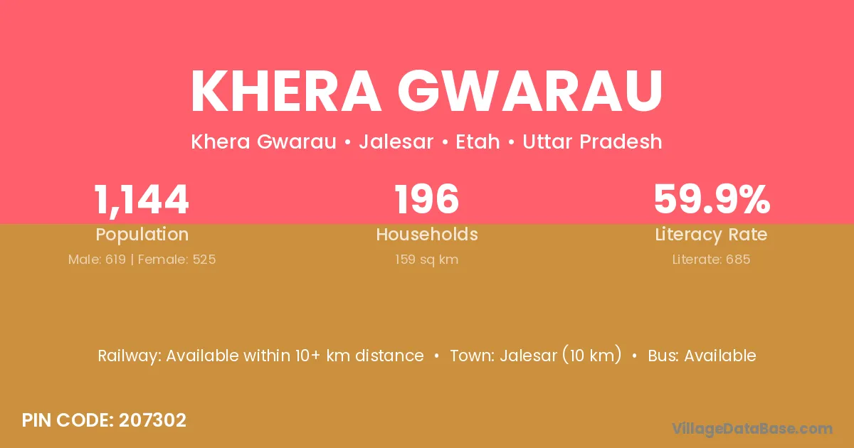 Jalesar (10 km) is the nearest town to Khera Gwarau village for major economic activities and is located approximately 10 km away.