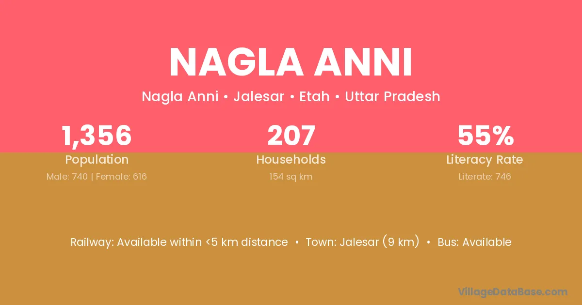 Jalesar (9 km) is the nearest town to Nagla Anni village for major economic activities and is located approximately 9 km away.
