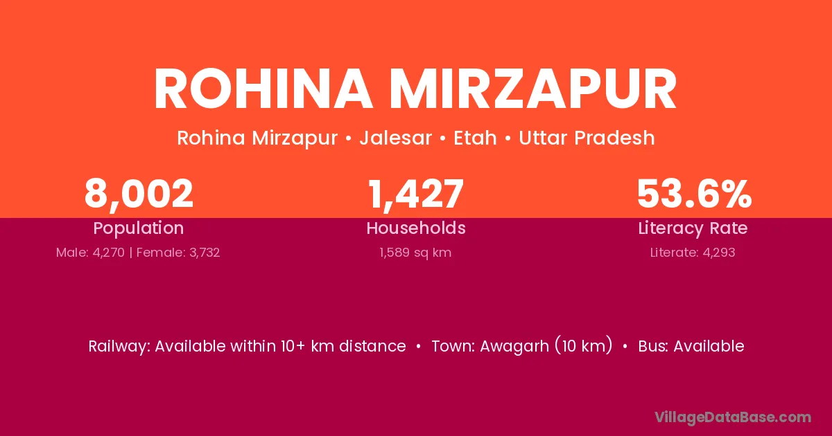 Awagarh (10 km) is the nearest town to Rohina Mirzapur village for major economic activities and is located approximately 10 km away.
