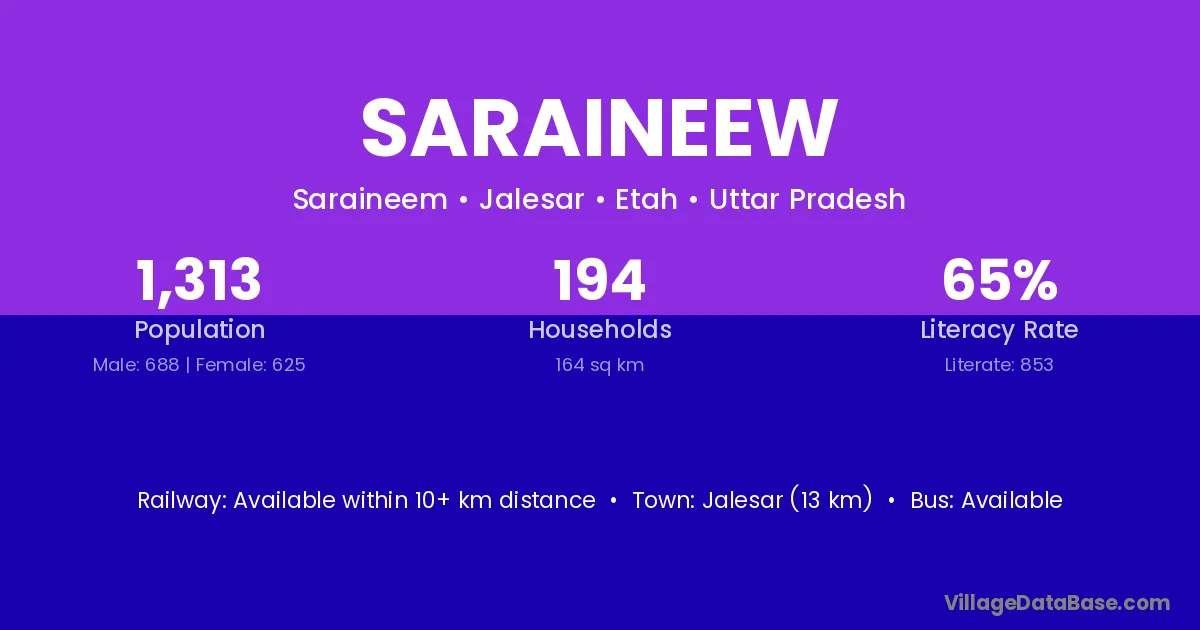 Jalesar (13 km) is the nearest town to Saraineew village for major economic activities and is located approximately 13 km away.