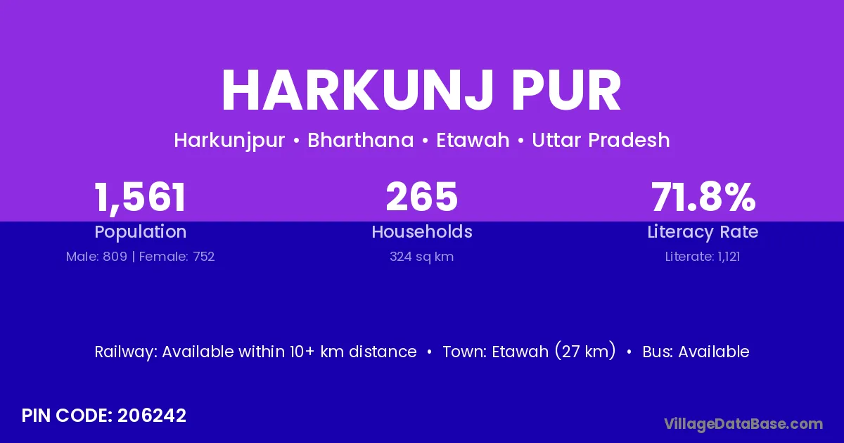 Etawah (27 km) is the nearest town to Harkunj Pur village for major economic activities and is located approximately 27 km away.
