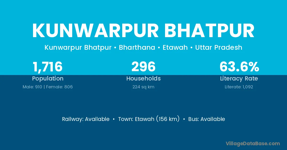 Etawah (156 km) is the nearest town to Kunwarpur Bhatpur village for major economic activities and is located approximately 156 km away.