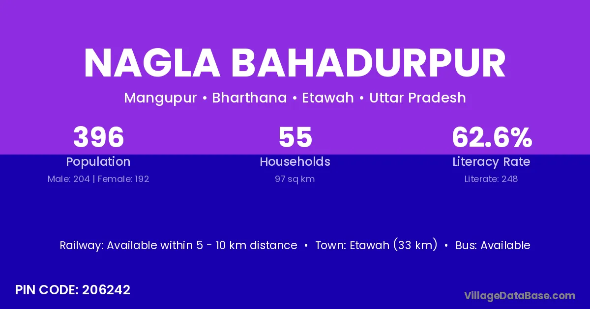 Etawah (33 km) is the nearest town to Nagla Bahadurpur village for major economic activities and is located approximately 33 km away.