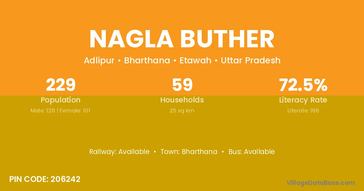 Nagla Buther village has a total population of 229 people, of which 128 are males and 101 are females.
