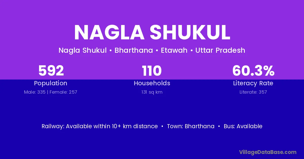 Nagla Shukul village has a total population of 592 people, of which 335 are males and 257 are females.