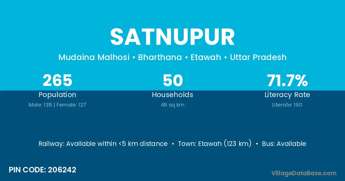 Etawah (123 km) is the nearest town to Satnupur village for major economic activities and is located approximately 123 km away.