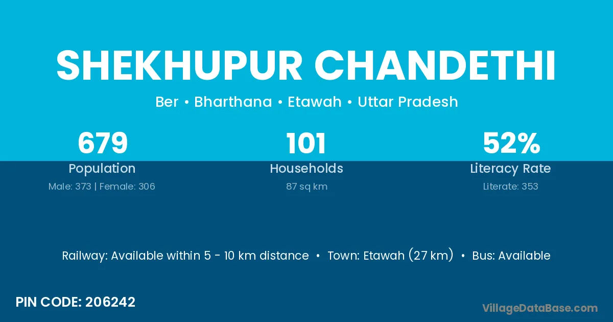 Etawah (27 km) is the nearest town to Shekhupur Chandethi village for major economic activities and is located approximately 27 km away.
