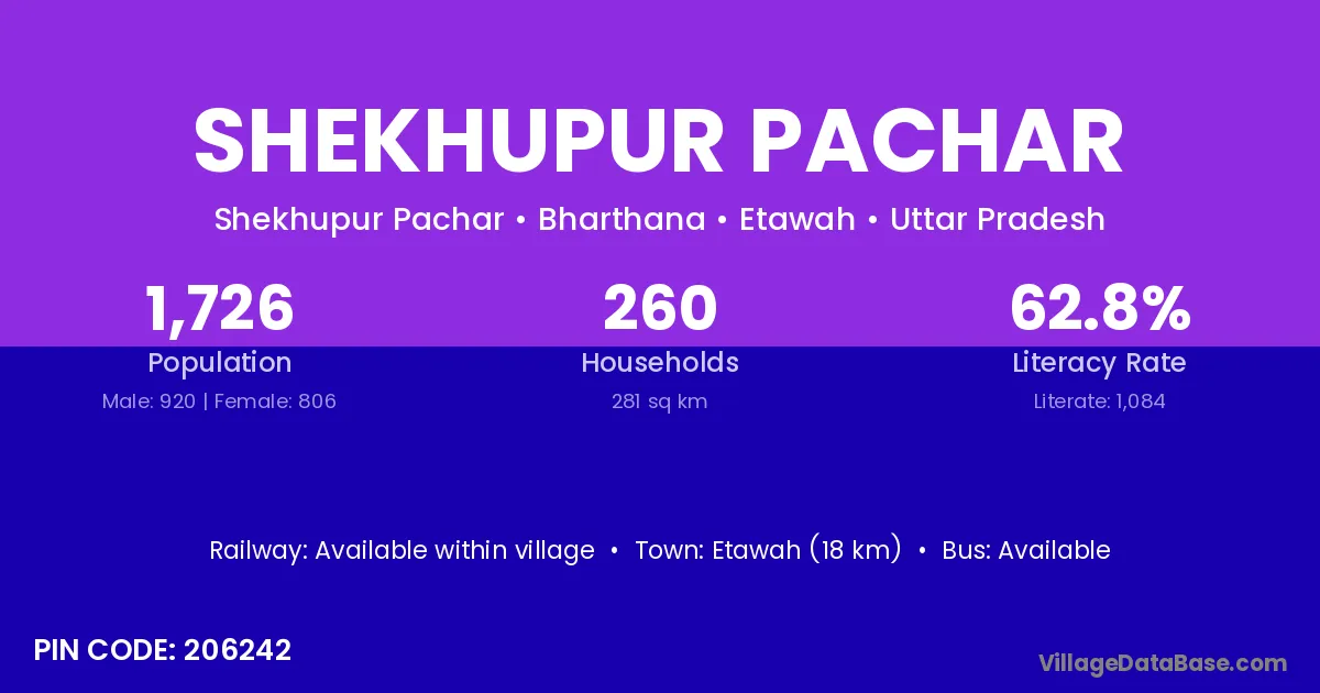 Etawah (18 km) is the nearest town to Shekhupur Pachar village for major economic activities and is located approximately 18 km away.