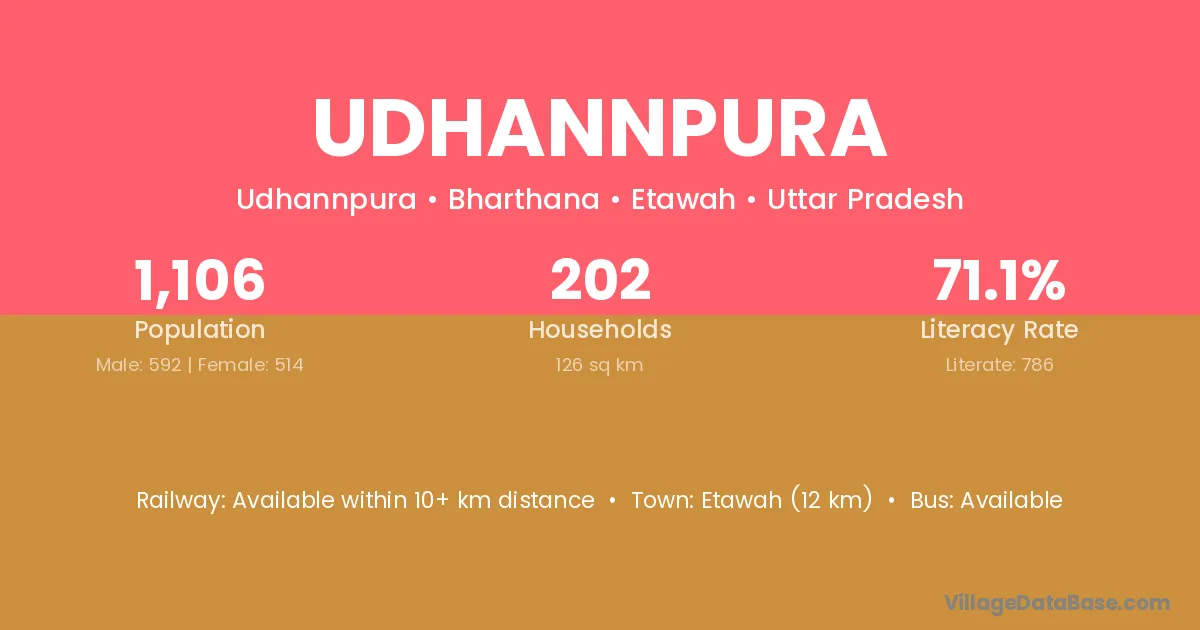 Etawah (12 km) is the nearest town to Udhannpura village for major economic activities and is located approximately 12 km away.
