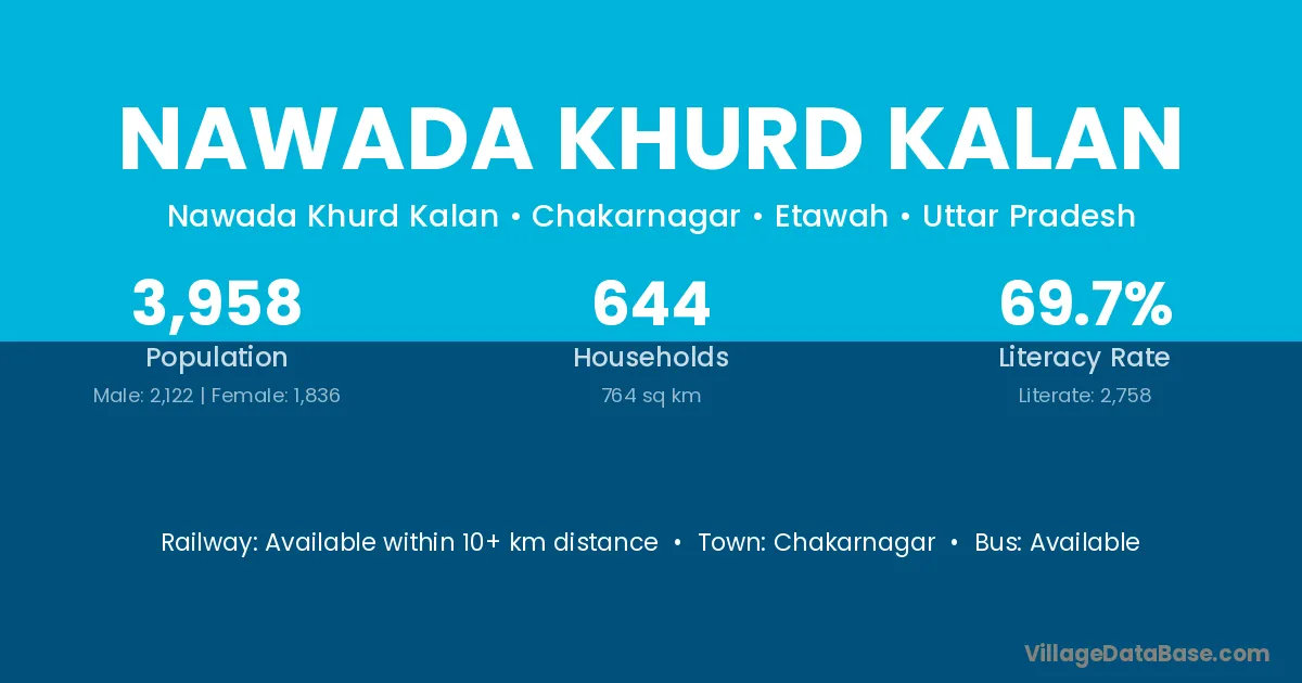Nawada Khurd Kalan village has a total population of 3,958 people, of which 2,122 are males and 1,836 are females.