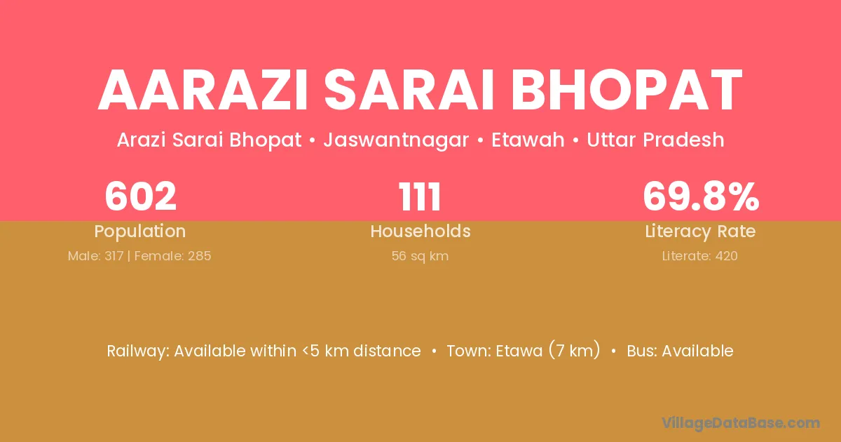Etawa (7 km) is the nearest town to Aarazi Sarai Bhopat village for major economic activities and is located approximately 7 km away.