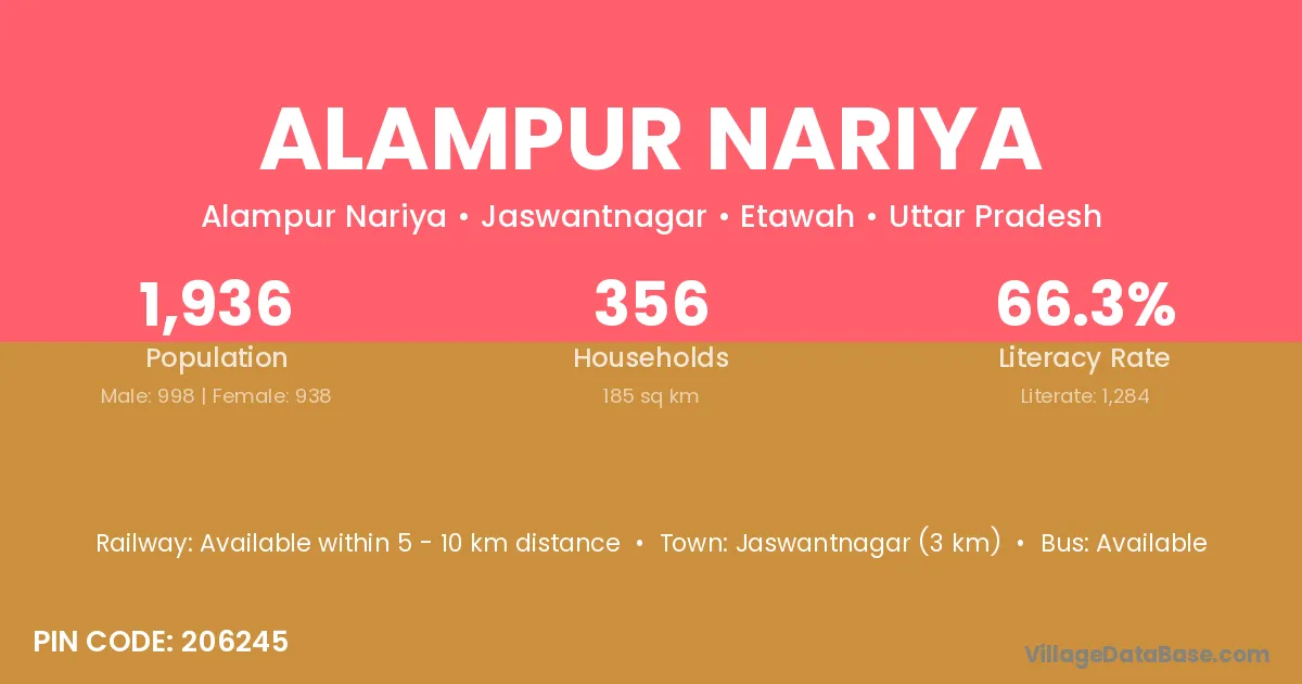 Jaswantnagar (3 km) is the nearest town to Alampur Nariya village for major economic activities and is located approximately 3 km away.
